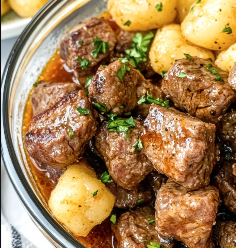 1. In a bowl, combine the steak bites with olive oil, minced garlic, dried thyme, salt, and pepper. Toss until the steak bites are evenly coated.