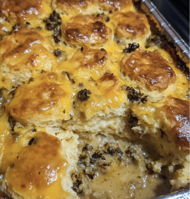 11. Pour the gravy over the baked biscuits in the casserole dish.
