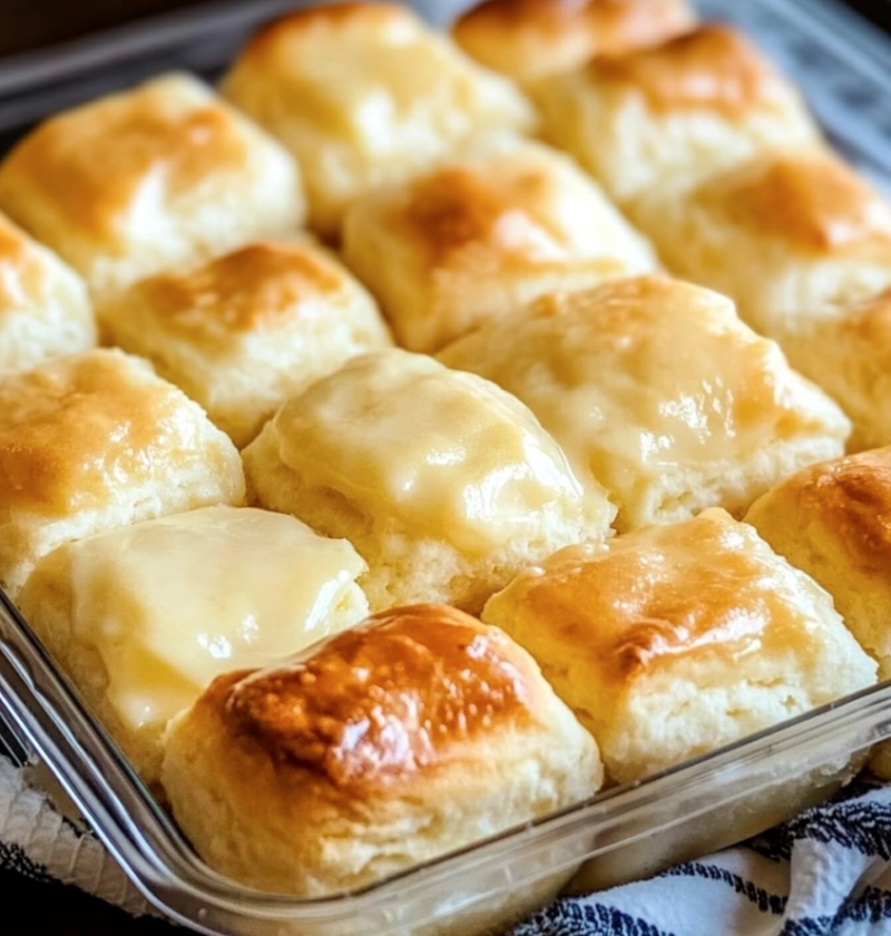 Melt an additional 1/4 cup of butter and pour it into a 9×13-inch baking dish. Place the cut biscuits into the baking dish, arranging them close together. The biscuits should be partially submerged in the melted butter.