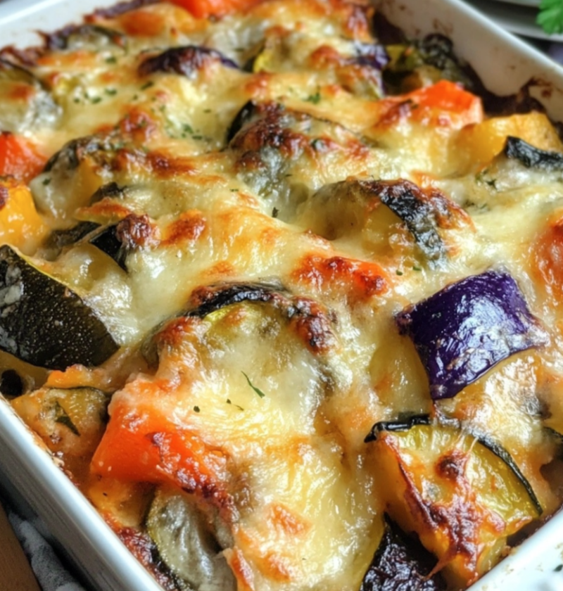 A delicious and comforting cheesy baked vegetable casserole filled with a variety of vegetables and topped with melted cheddar, mozzarella, and Parmesan cheeses.