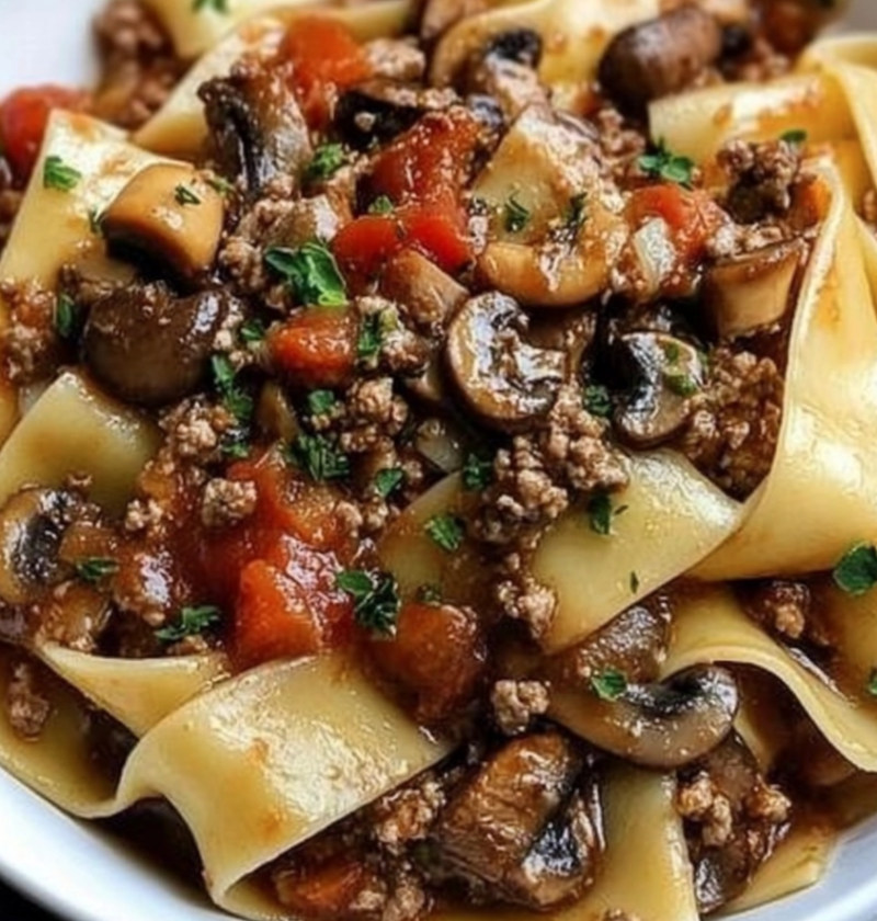 Pappardelle with Ground Beef and Mushroom Tomato Sauce