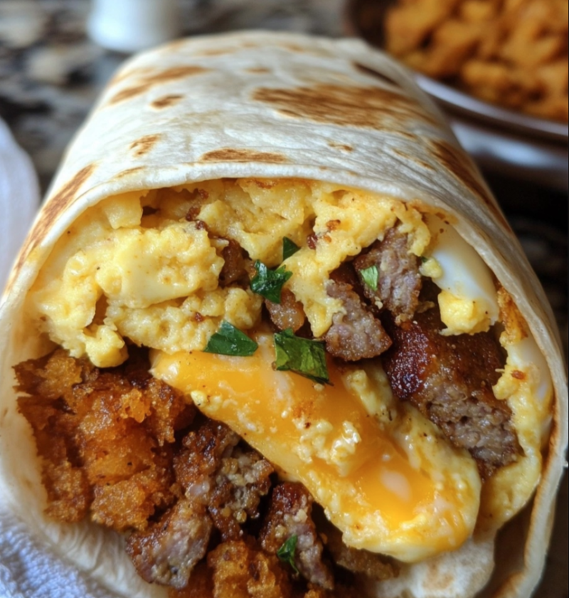 Sausage, Egg & Cheese Breakfast Burrito with Crispy Hashbrowns