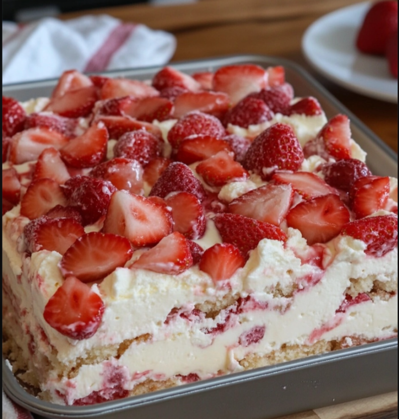A delightful no-bake dessert that combines the freshness of strawberries with the smoothness of cream cheese in a light and creamy cake.